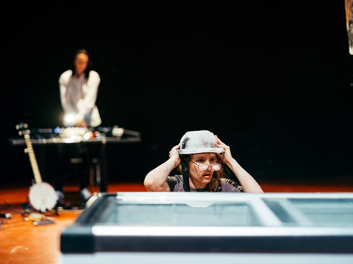 Nüganen, Kisling and Sova, as a reaction, open up their ice-manufacturing enterprise. In the backdrop of nightmares and constant dripping they navigate between multiple perspectives on locality, accompanied by CDJs and a banjo. At Earth magnitude they are specks of dust, and next to geological time as-if on speed. They trace locality from places where the influence of one dominant culture has made imported goods part of folklore, while the word 'local' still adds value when making choices as a tourist. "Ash, horizon, riding a house" is a series of chain-reactions that invites the audience to envision a belonging - one that cannot be seen from here. It must be imagined.