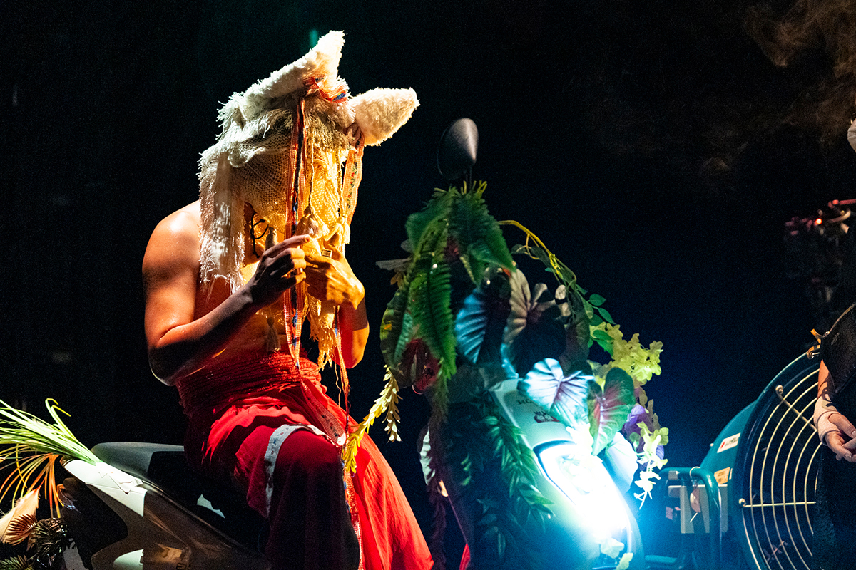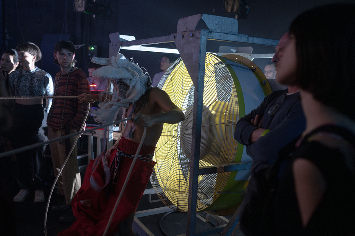 In the immersive setting created by Tianzhuo Chen, Ocean Cage combines elements of installation, film and dance to create the space for the performance, in which Siko Setyanto becomes the central protagonist in changing characters. Together with the Indonesian musicians Kadapat and Nova Ruth, a visual, dance and musical maelstrom is created in which tradition and ecology, spiritually and technology, beliefs in progress and interspecies symbiosis are whirled together.